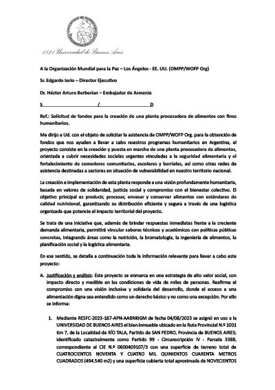 Request for funding for the creation of a food processing plant for humanitarian purposes. UBA Project.